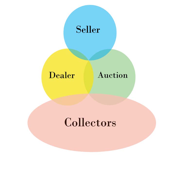 Despite the common perception, auction houses do not always get the most money for items. As a result, dealers make up a huge percentage of buying dollars in the auction market. Conversely, some collectors prefer buying in a competitive environment over buying from a dealer. While other collectors prefer to buy exclusively from dealers 90% of the time.